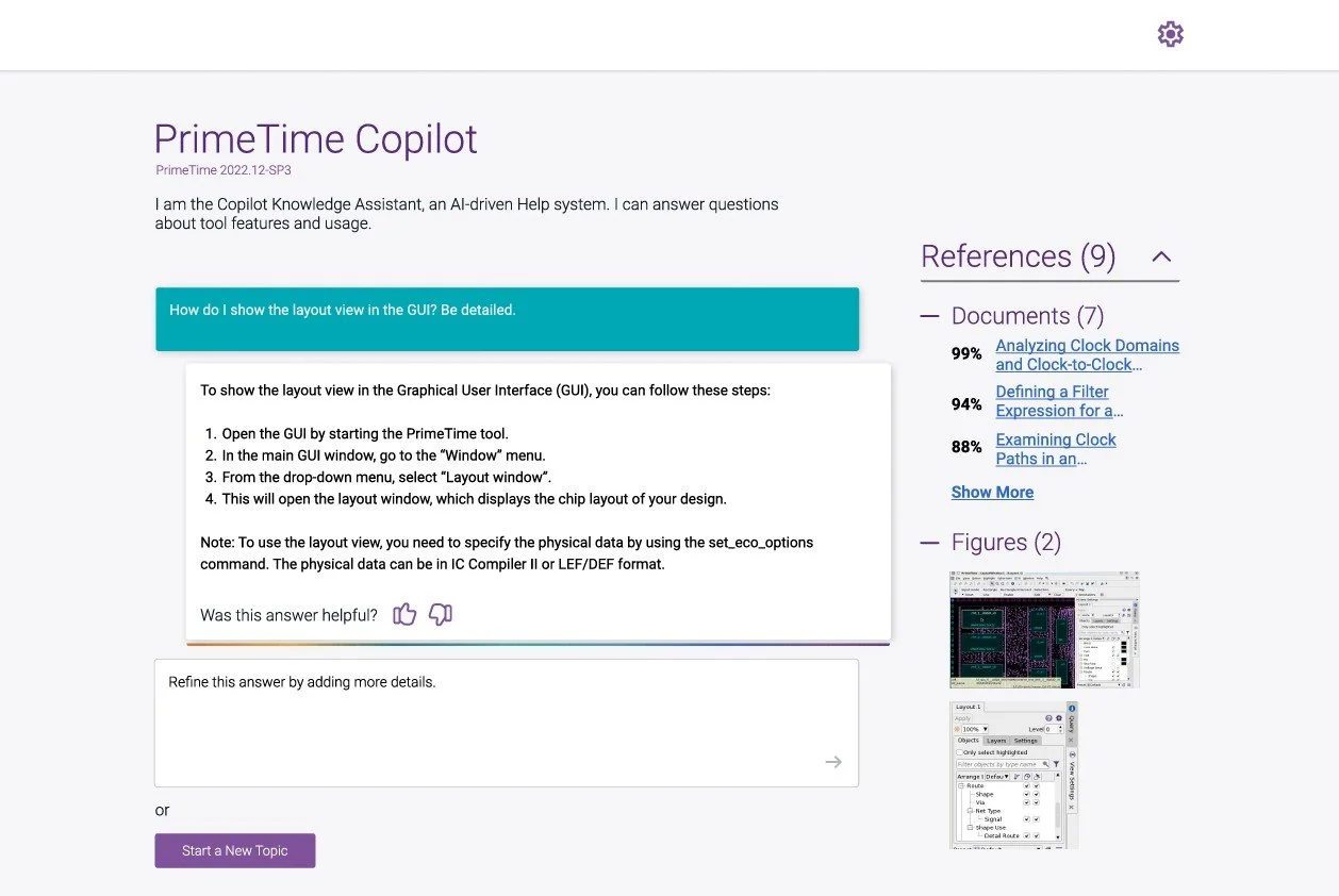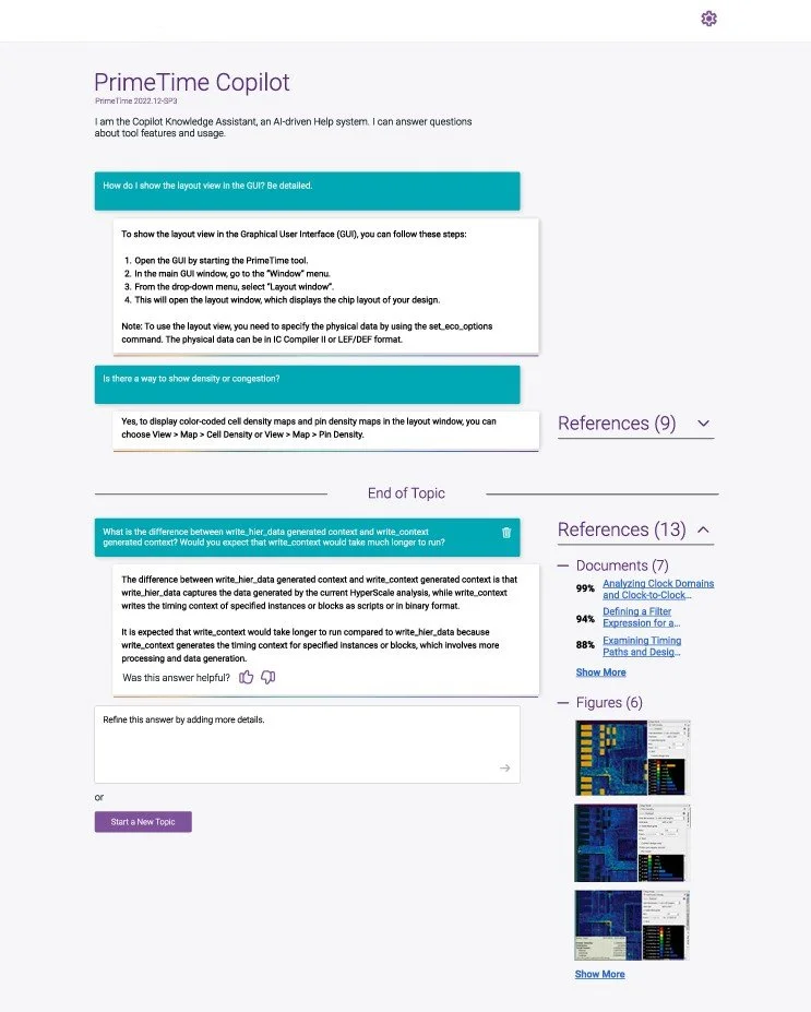 The final experience introduced a guided input field with contextual prompts that helped users describe their issue with greater specificity upfront. The guidance panel surfaced dynamically — present when needed, out of the way when not. References, figures, and related documents were made available alongside answers, allowing users to go deeper without escalating to a human.