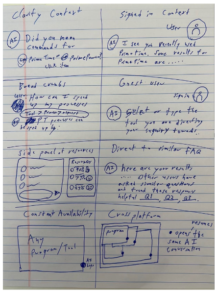 Early ideation explored two directions clarifying context before submission versus signing users into context automatically. We tested both approaches against real ticket language from the SME interviews.