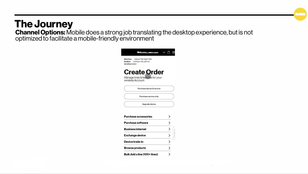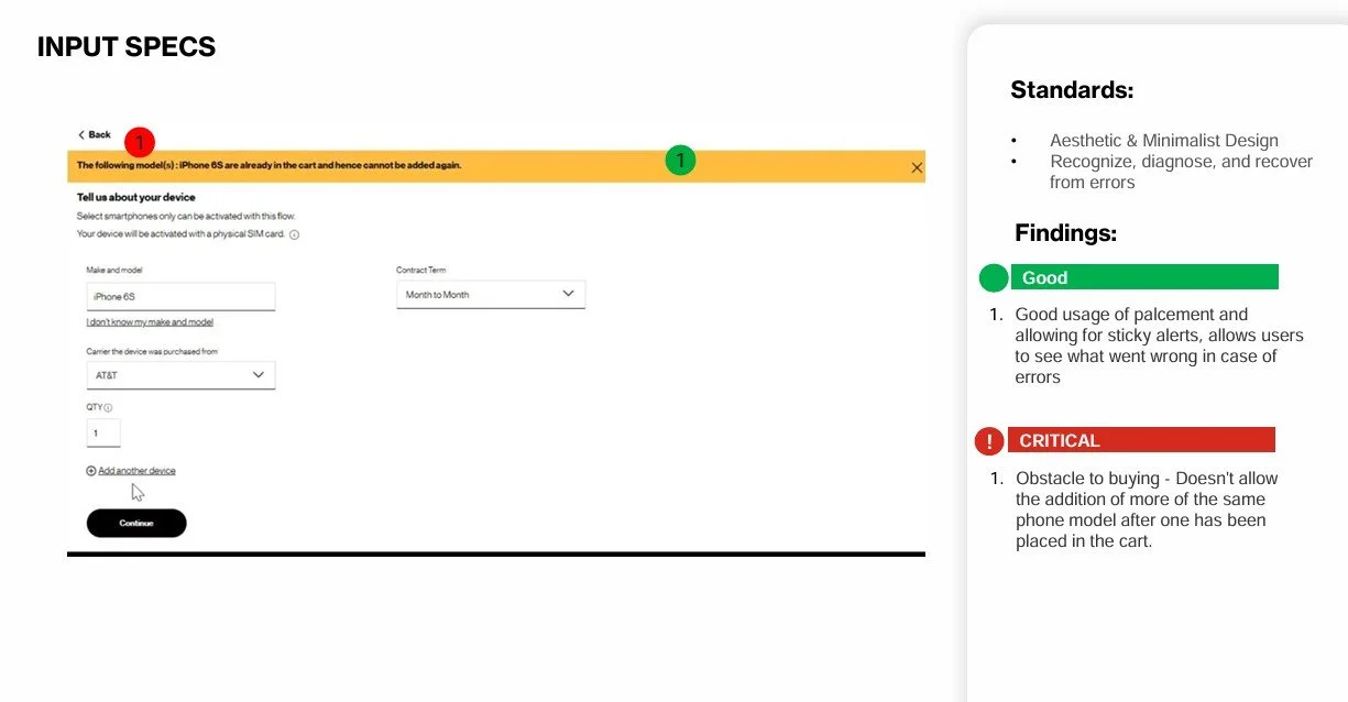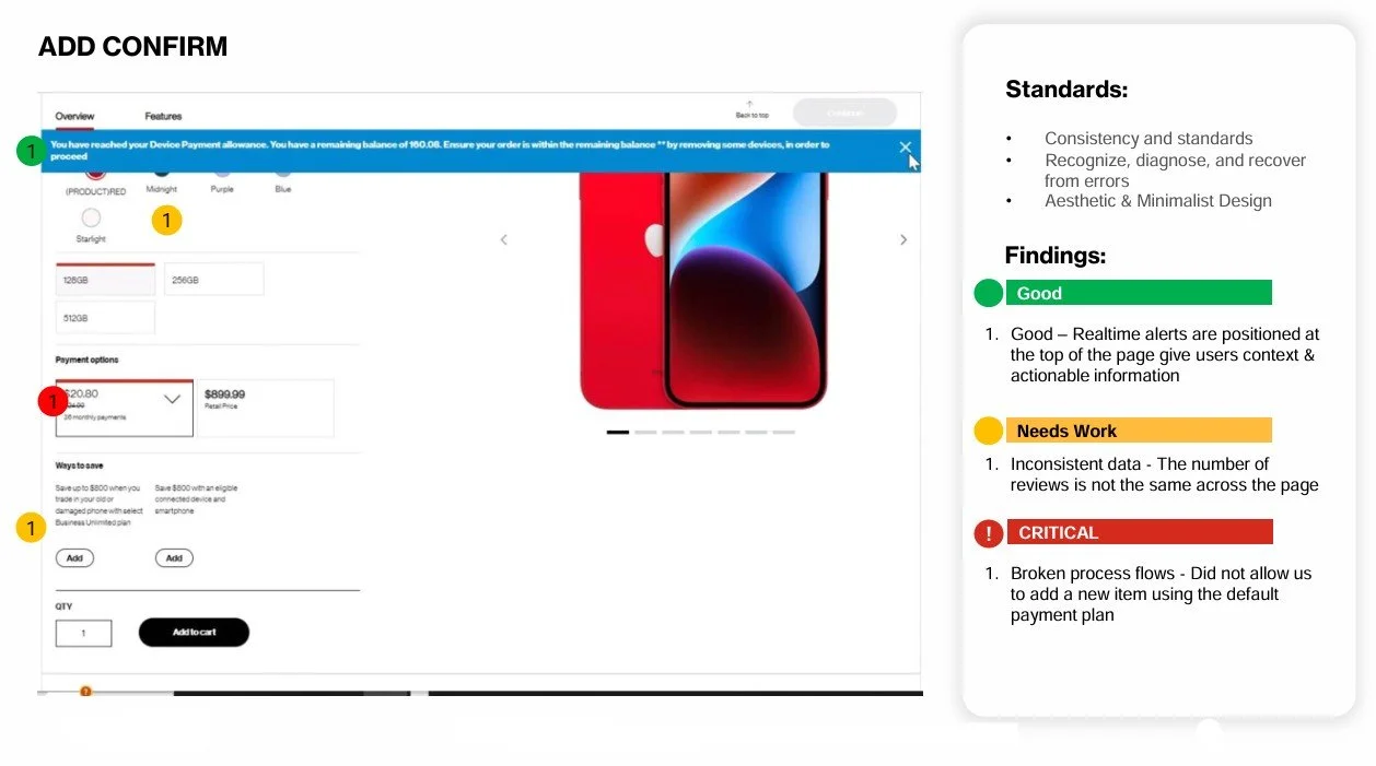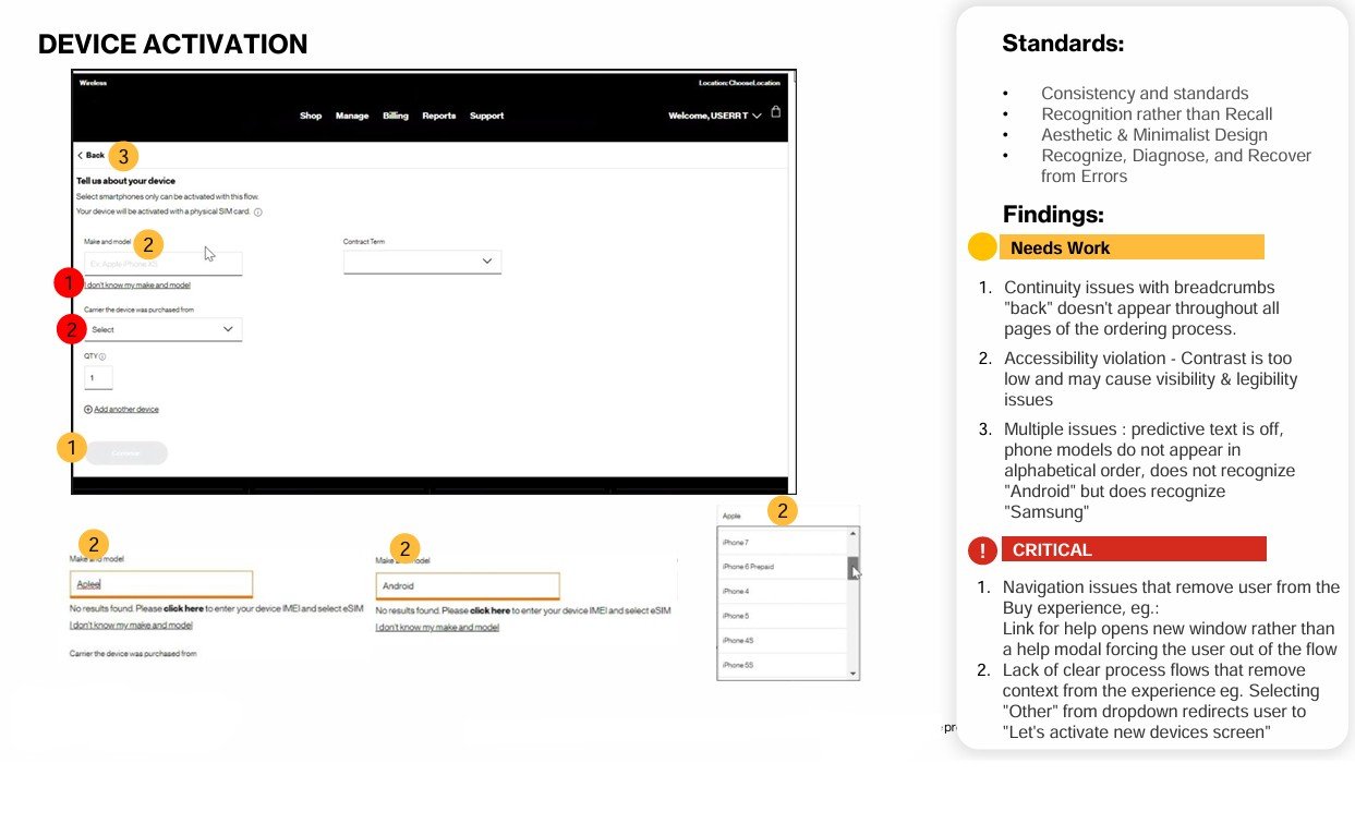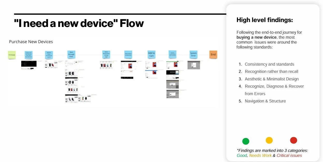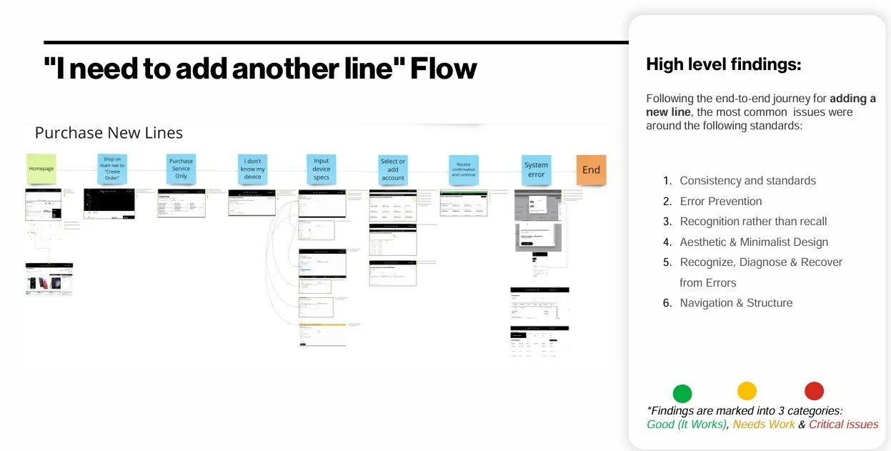 We mapped three primary user flows that represented the highest-frequency jobs customers came to the platform to complete: purchasing a new device, adding a line, and paying a bill. Each flow was walked end-to-end and evaluated against Nielsen's ten heuristic standards.