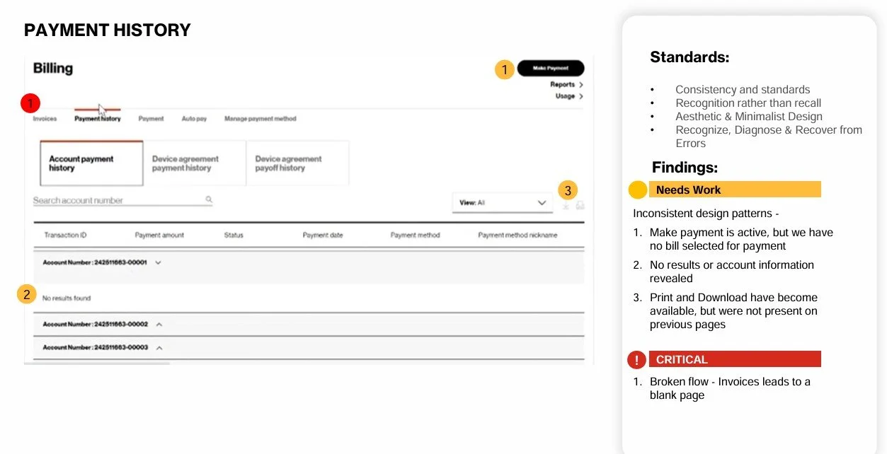 A major US telecommunications provider had an account management experience that had grown without direction for years. Navigation accumulated. Flows broke. Users got lost trying to do basic things like pay a bill or add a line. My team was brought in to find out exactly how bad it was and to build the case for what fixing it could look like. I led the UX audit, mapping three end-to-end user flows against Nielsen's heuristic standards, triaging every finding by severity, and delivering a strategic recommendations framework that leadership used to pursue further client work orders.