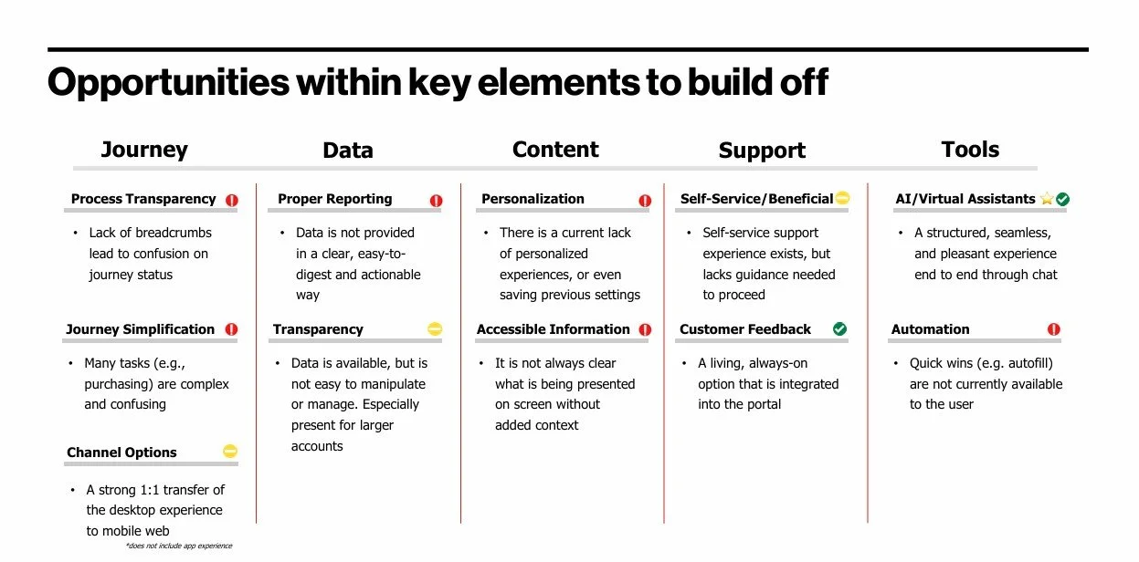 Findings were synthesized into five strategic opportunity pillars: Journey, Data, Content, Support, and Tools. This framing translated UX findings into business language that strategists and PMs could take directly into client conversations.