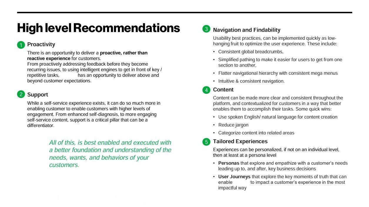 High-level recommendations were organized around five themes: proactivity, support, navigation and findability, content clarity, and tailored experiences. Quick wins such as consistent breadcrumbs, simplified pathing, and natural language content were identified separately from longer-term strategic investments like personalization and AI-assisted support.