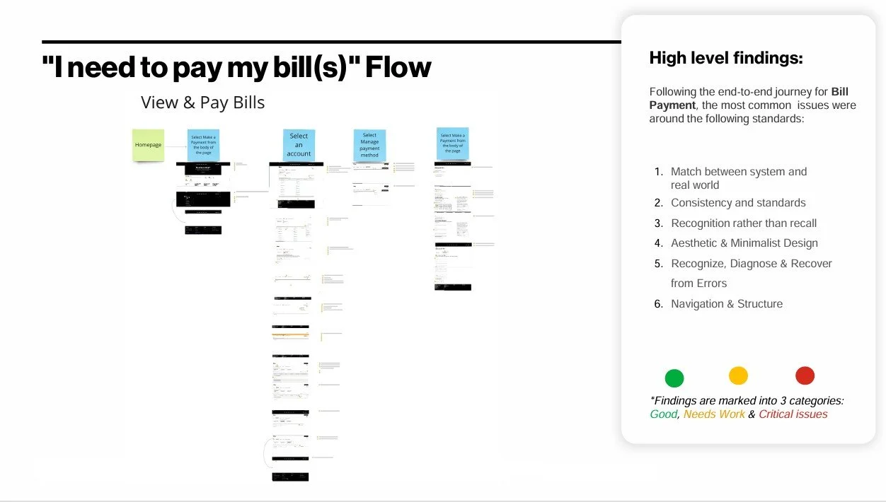 Every screen in each flow was evaluated and findings were triaged into three severity levels Good, Needs Work, and Critical. Critical findings were those that actively blocked task completion or removed users from the experience entirely. Needs Work findings degraded confidence and clarity without fully breaking the flow.